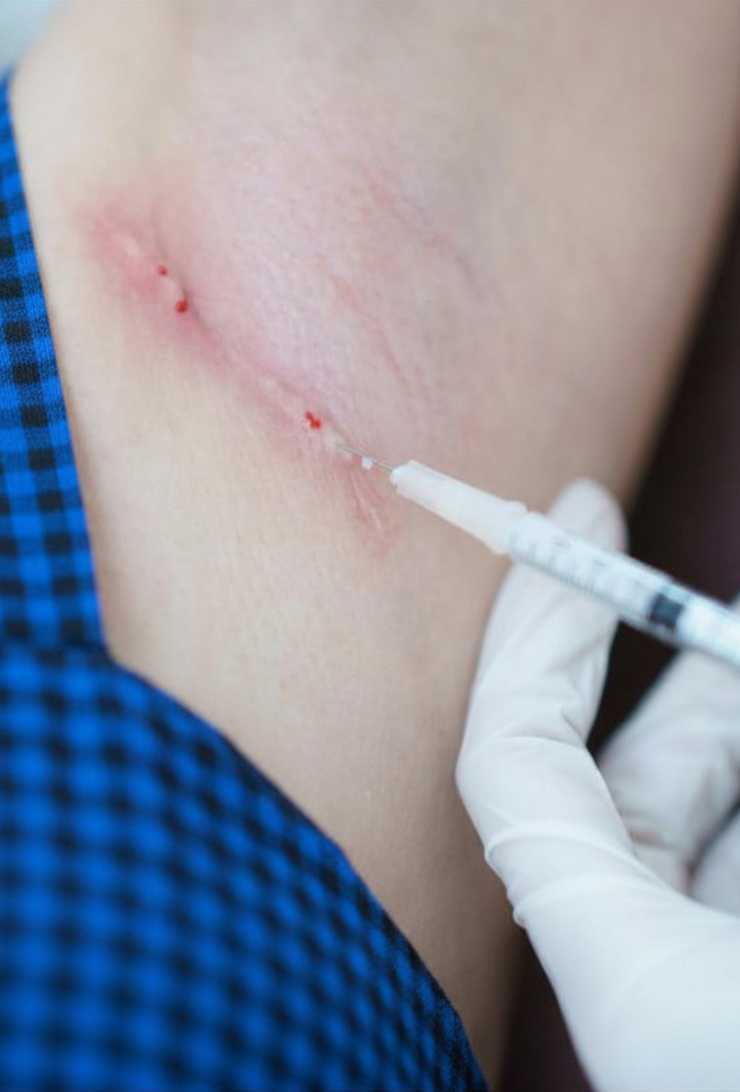 Infiltração de queloides com Triancil® reduz volume, vermelhidão e sintomas, promovendo melhora estética com aplicação precisa, segura e eficaz.